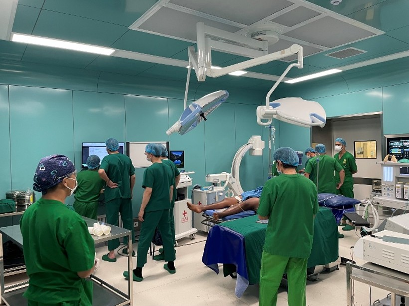 午後にはCambodia-China Friendship Preah Kossamak Hospitalに移動しました。22歳男性に生じたC4/5片側椎間関節脱臼による脊髄損傷に対する手術が予定されていました。カンボジアでは保険料を支払えない人には公立病院で無償の医療が提供されますが、その内容は限定的です。本症例の患者さんも経済的な理由から医療保険を支払っていなかったため、MRIを撮影することができませんでした。執刀医は2年前に来日したDr. Puth Chendaでした。頚椎脱臼骨折を前方後方どちらから整復固定するかは術者や施設、国によって方針が異なると思われますが、本例では、まず病院にメイフィールドのピンが無く(紛失後に経済的な理由から補充できない)腹臥位で手術ができない、また患者さんが頚椎後方インプラントの費用を払えない、また頚椎前方の椎体間ケージの費用も払えない(カンボジアではケージ1個の方がプレート1枚とスクリュー4本より高額)、との理由から腸骨移植による前方手術しか選択肢はありませんでした。手術には湯川先生、青山先生が指導的助手として参加され、無事に完遂されました(図3)。Cambodia-China Friendship Preah Kossamak Hospitalは数年前に新病棟が建設され、手術室もとても綺麗でしたが(図4)、手術資材は不足しておりました。私たちは主に医学的視点から手術方針を決定しますが、病院と患者さんの経済状況から術式を決定しなければならないカンボジアの現実を目の当たりにしました。