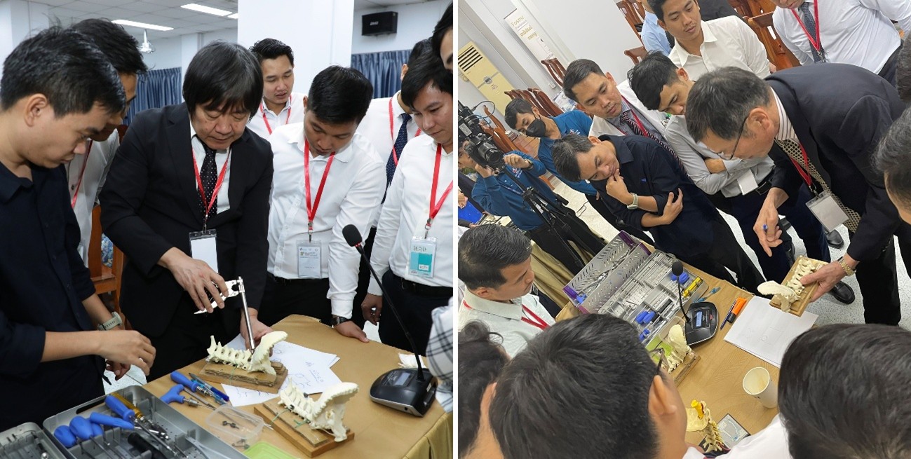 二日目の3月7日はKhmer-Soviet Friendship Hospitalに戻り、The 8th Joint International Seminar and Workshop of Cervical Spine Surgeryが開催されました(プログラム別添)。午前中にセミナー、午後に手術手技ワークショップを行い、50名以上の現地の先生が参加されました (図5)。