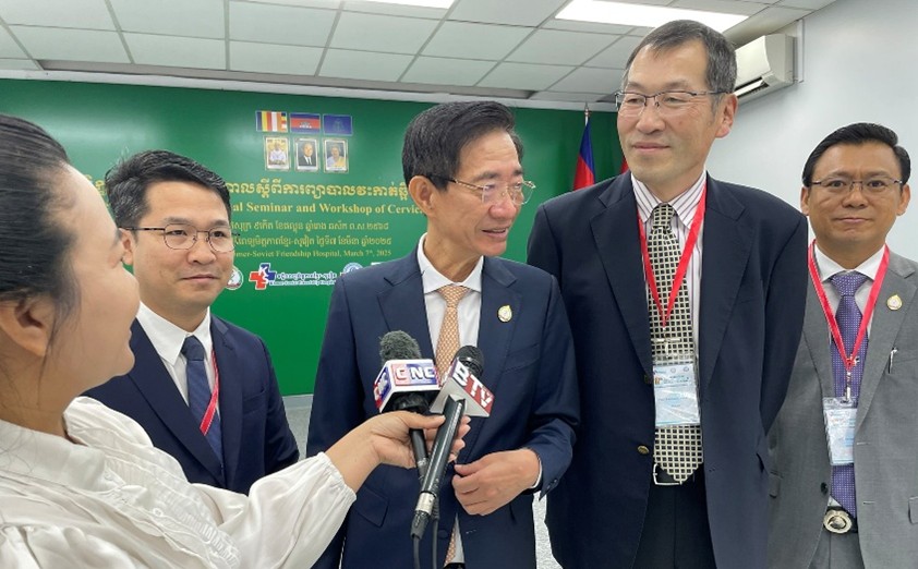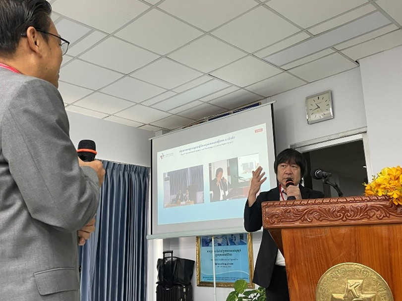 Sim Sokchanカンボジア脳神経外科学会理事長、湯川先生、Ngy Meng病院長の挨拶の後、日本からの各医師が2演題ずつ、若手医師を対象として頚椎疾患・外傷の診断から手術までの合計6つの講演を行いました。積極的に多くの質問が寄せられ、明日からの診療に役立てたいというカンボジアの若い先生方の気持ちが伝わって気ました(図6)。特にinstrumentation手術に対する質問が多く、手術適応、手技、固定範囲などについて、充実したやり取りがなされました。日本からの講演の後は、カンボジア側から6名の先生方が登壇され、小児の歯突起骨折、成人の上位頚椎外傷、メッシュケージを使った前方固定術の治療経験などが発表されました。高度な環軸関節亜脱臼に対する後方固定術など、難易度が高い手術が当たり前のようにされており強く感銘を受けると同時に、病院間の医療資源の差、医師間の手術経験の差が大きいことも計り知れました。私たち日本人医師の訪問は、日本・カンボジア間の交流だけでなく、カンボジアの先生方が集まって互いの経験を共有する貴重な機会にもなると感じました。さらには、地元テレビ局が取材に訪れており、湯川先生が日本側を代表してインタビューに応じました(図7)。我々の取り組みが医師だけでなく、医療を通して地域にも貢献し得る活動であることを感じることができました。