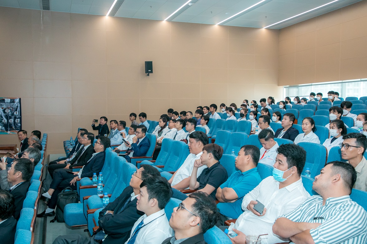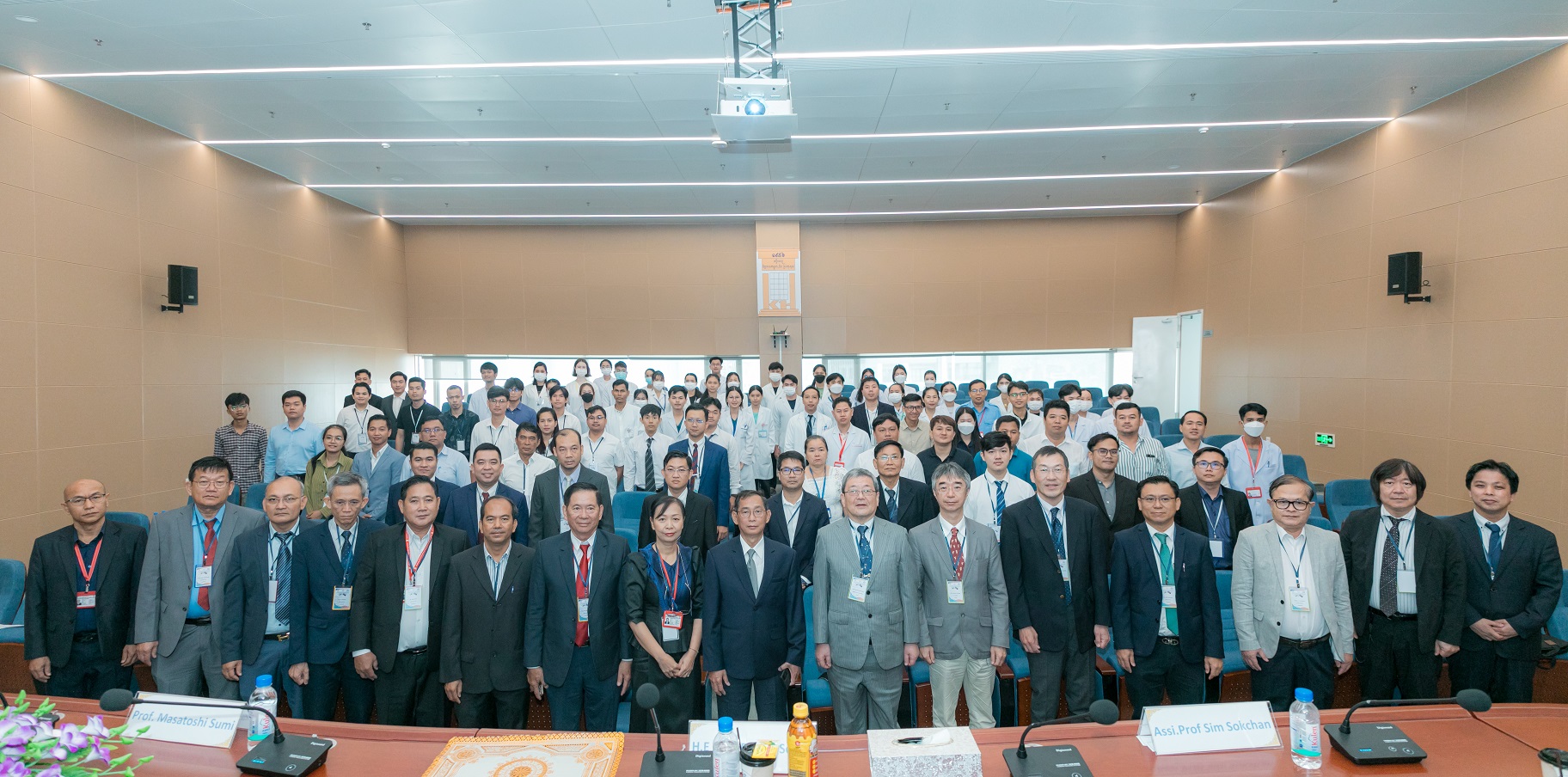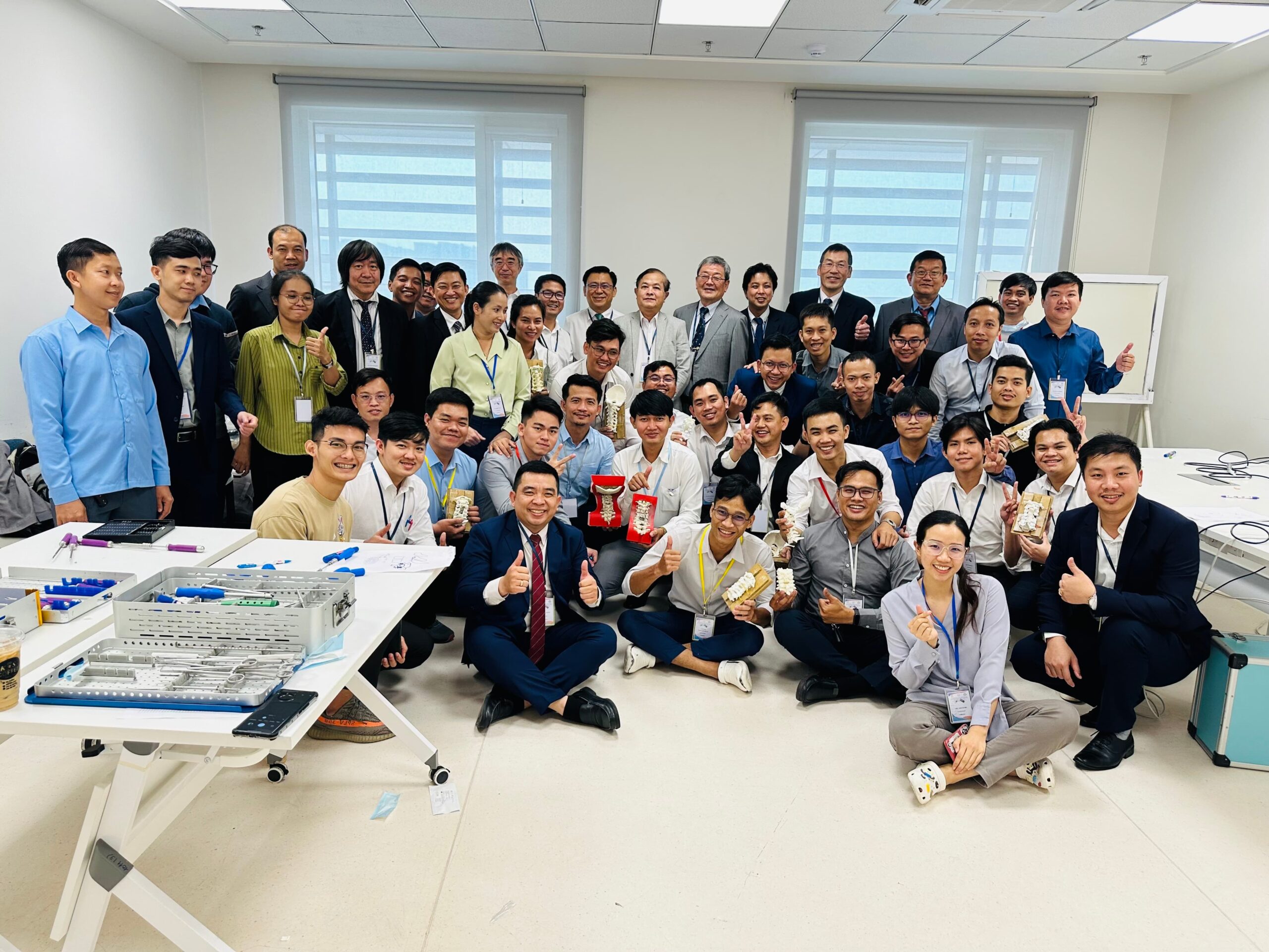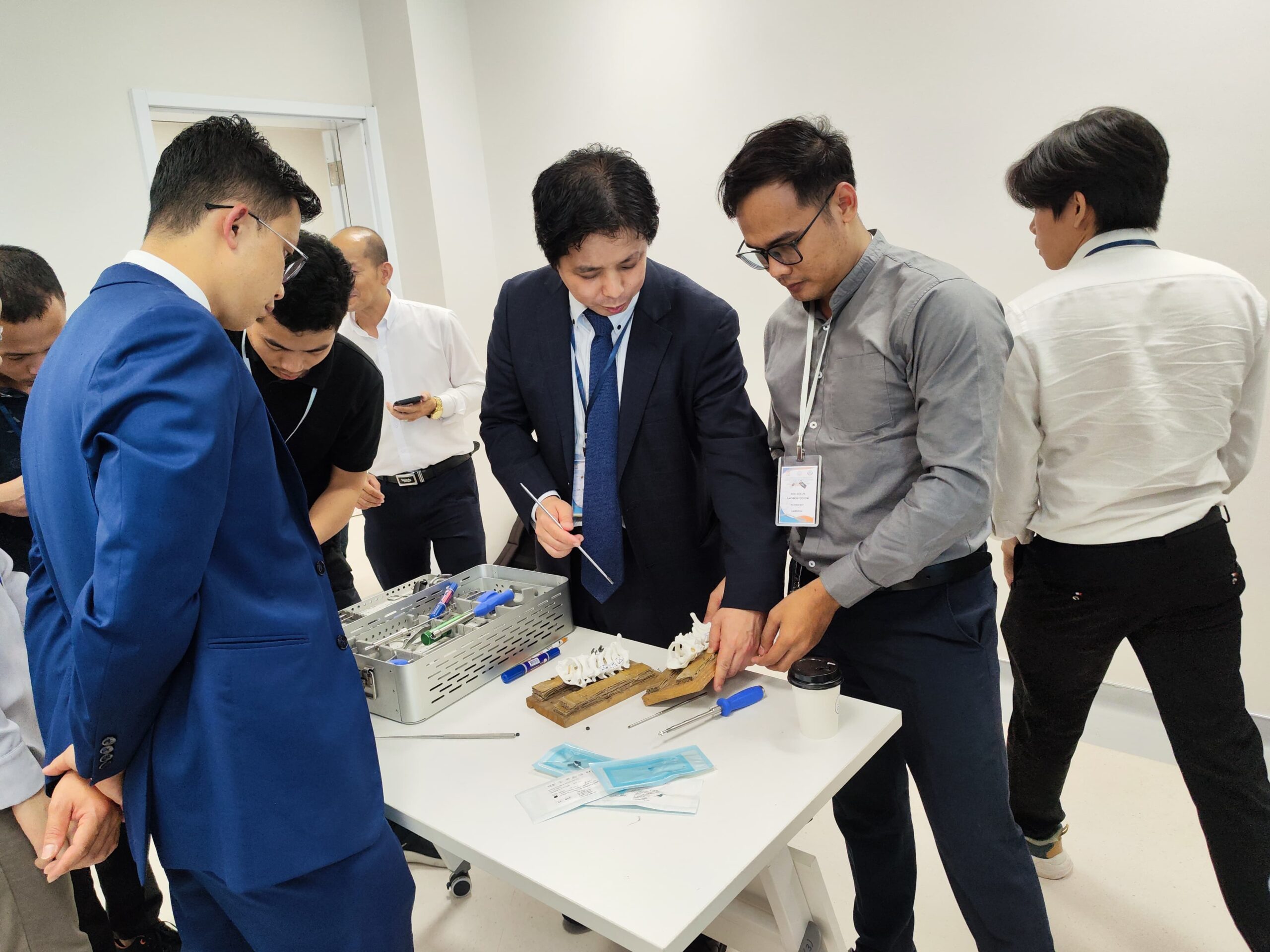 セミナーは新病院となりましたPreah Kossamak Hospitalにて、50名以上の現地の先生が参加され開催されました (図2-4)。病院長、Sim Sokchanカンボジア脳神経外科学会理事長、鷲見先生の挨拶の後、日本からの訪問団が登壇し、若手医師をターゲットとした頚椎領域の診断から治療までの6つの講演が行われました。若手も含め冒頭から積極的な質問が多数みられ、カンボジアの医師の意気込みが感じられました。日本の先生方の講演の後、カンボジア側から軸椎歯突起骨折に対する前方螺子固定に関するCase seriesの発表がありました。研究への組み入れ患者の平均年齢は若く、日本とは異なる疾患罹患背景でありましたが、前方螺子固定の利点と欠点を考察に含め大変しっかりとご発表されておりました。続いてカンボジア側の若手-中堅医師からの症例報告がありました。限られた医療資源の中、頚椎損傷に対し前後合併手術や頚椎椎弓根スクリューを用いた脱臼整復・矯正固定術を施行しておりました。また、脊髄腫瘍の手術例の発表も複数あり、術式などについて大変活発な討論が行われました。質疑では術後患者のフォローアップについて話題が挙がりました。多くの患者は首都プノンペンから遠く離れた村や町から何日もかけて受診するようでした。術後、地元に戻った後の定期的な受診はなかなか困難のようでしたが、電話で症状を問い合わせたり、患者の歩行状態や運動機能を撮影した動画を送付してもらうことで患者の術後経過を丁寧にフォローしておりました。5年前は無かった術後患者をフォローする習慣が芽生えてきており、治療に対するカンボジアの先生方の姿勢の変化を感じました。セミナーの途中で模擬骨を用いたハンズオンセミナーを行いました。4つの班に分かれ、それぞれ、(1)電動ドリルを用いた椎弓形成術、(2)頚椎椎弓根スクリュー挿入法、(3)頚椎外側塊スクリュー挿入法、(4)頚椎前方除圧固定術の手術手技についてレクチャーしました。こちらも大変盛況で、参加の若手先生から積極的な質問を多数いただきながら、大変充実したワークショップとなりました。実際に手を動かしながらの実習が盛り上がるのは万国共通のようでございます。