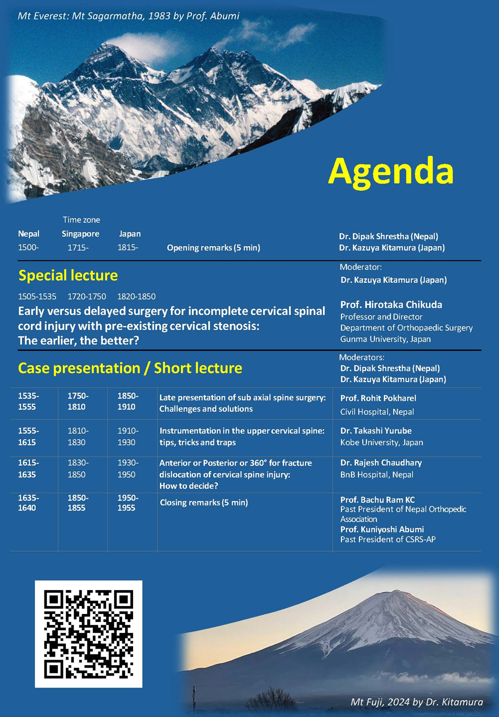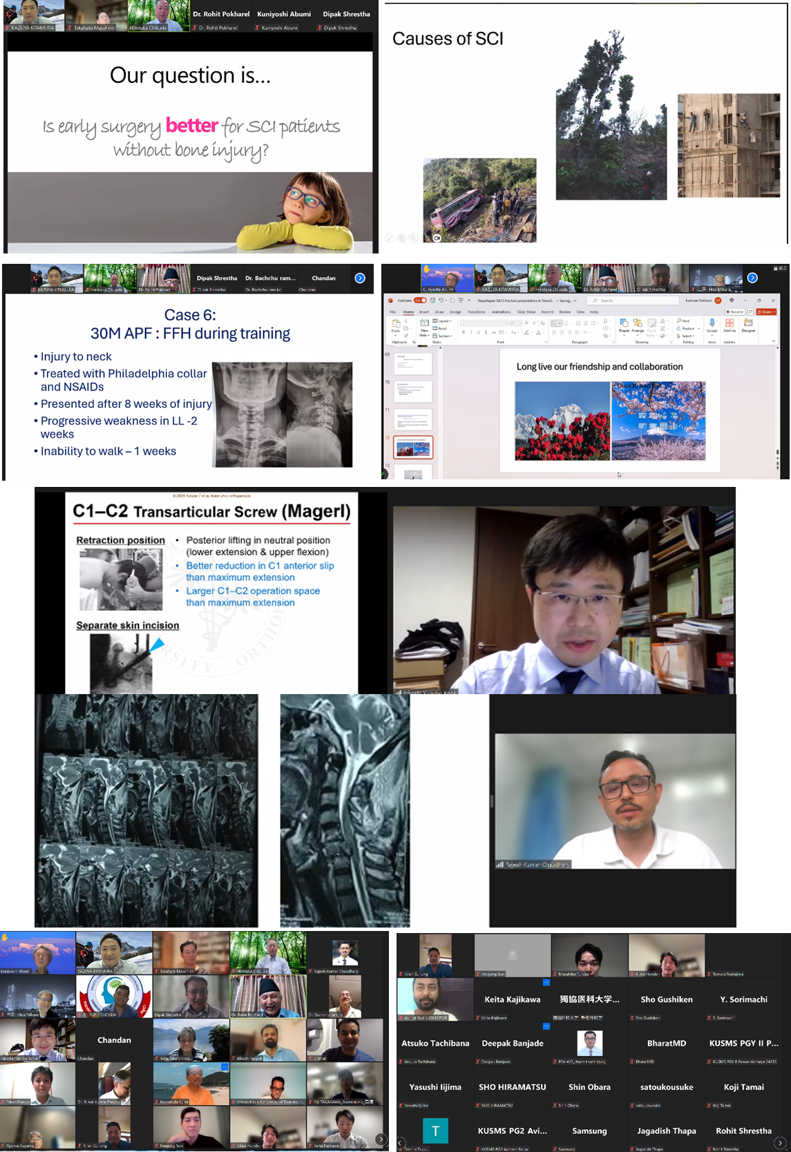 今回からセミナーのテーマを設定いたしました。今回は”Cervical Trauma”のテーマのもと、群馬大学整形外科教授の筑田博隆教授から、” Early versus delayed surgery for incomplete cervical spinal cord injury with pre-existing cervical stenosis: The earlier, the better?” をご講演いただきました。世界的にも結論が出ていないトピックであり、日本で行われたランダム化比較試験の結果と、それに基づいた現在の治療方針について解説していただきました。その後、⽇本側からは神戸大学整形外科の由留部崇先生が、上位頚椎の固定術における様々な手術手技について、それぞれのメリット、デメリット、適応とコツについて発表されました。ネパール側からは Dr. Pokharelがネパールの頚椎・頚髄損傷の疫学と診断遅延例の治療方針について、Dr. Chaudharyが頚椎脱臼骨折に対する手術アプローチをいかに決定するかについて、それぞれこれまでの治療経験を共有され、いずれの発表に対しても活発な討論が行われました。外傷の病態だけでなく、異なる社会背景が治療の実際に反映されていることを実感する、⼤変勉強になる機会でした。セミナーの最後に、約20年前にネパールと日本の交流を始められたProf. BachuRamKCと鐙邦芳先生からclosing remarkがなされ、盛会のうちにセミナーは終了いたしました。